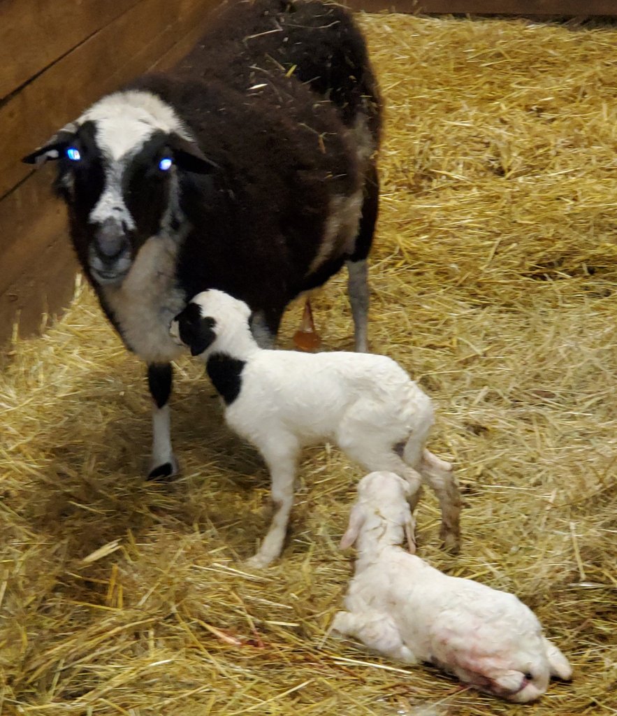 Registered St Croix, Flora, had twins! 9lb ram lamb and 7lb ewe lamb out of Registered Katahdin ram, Big Red. Her first time having twins! She took care of them like a champ. It’s amazing how a crazy wild ewe suddenly becomes completely calm and docile at lambing. PS. Her dirty face is molasses haha.