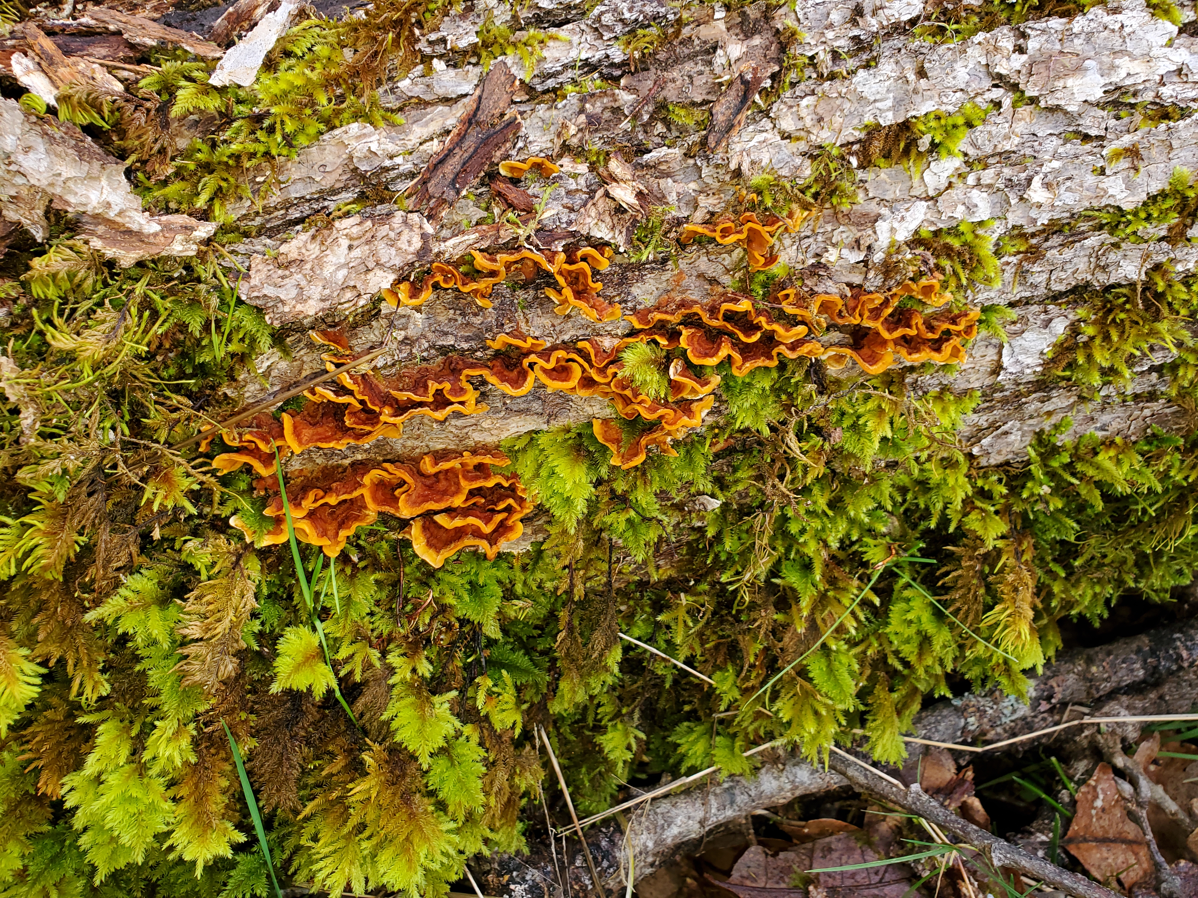 Yesterday Shane and I went down into the lower pasture to set up the Trail Cam on a deer trail to see what passes through. On the way back I saw some cool False Turkey Tail fungus on an Oak log. Pictures below.