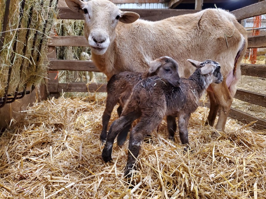 This bony, kind of homely, registered Katahdin ewe, Sonja (with a massive udder, her saving grace) gave me 9lb and 11lb twin ewe lambs out of Recorded Katahdin Ram, Crichton (he’s 37.5% on paper but 100% Katahdin in reality, yes he’s named after the author, Michael Crichton). Crichton’s mother has never given us ewe lambs so I decided to keep a ram lamb of hers to try on a couple ewes. Here we are, 2 girls already! He has one more ewe to go and his mother still needs to lamb.
