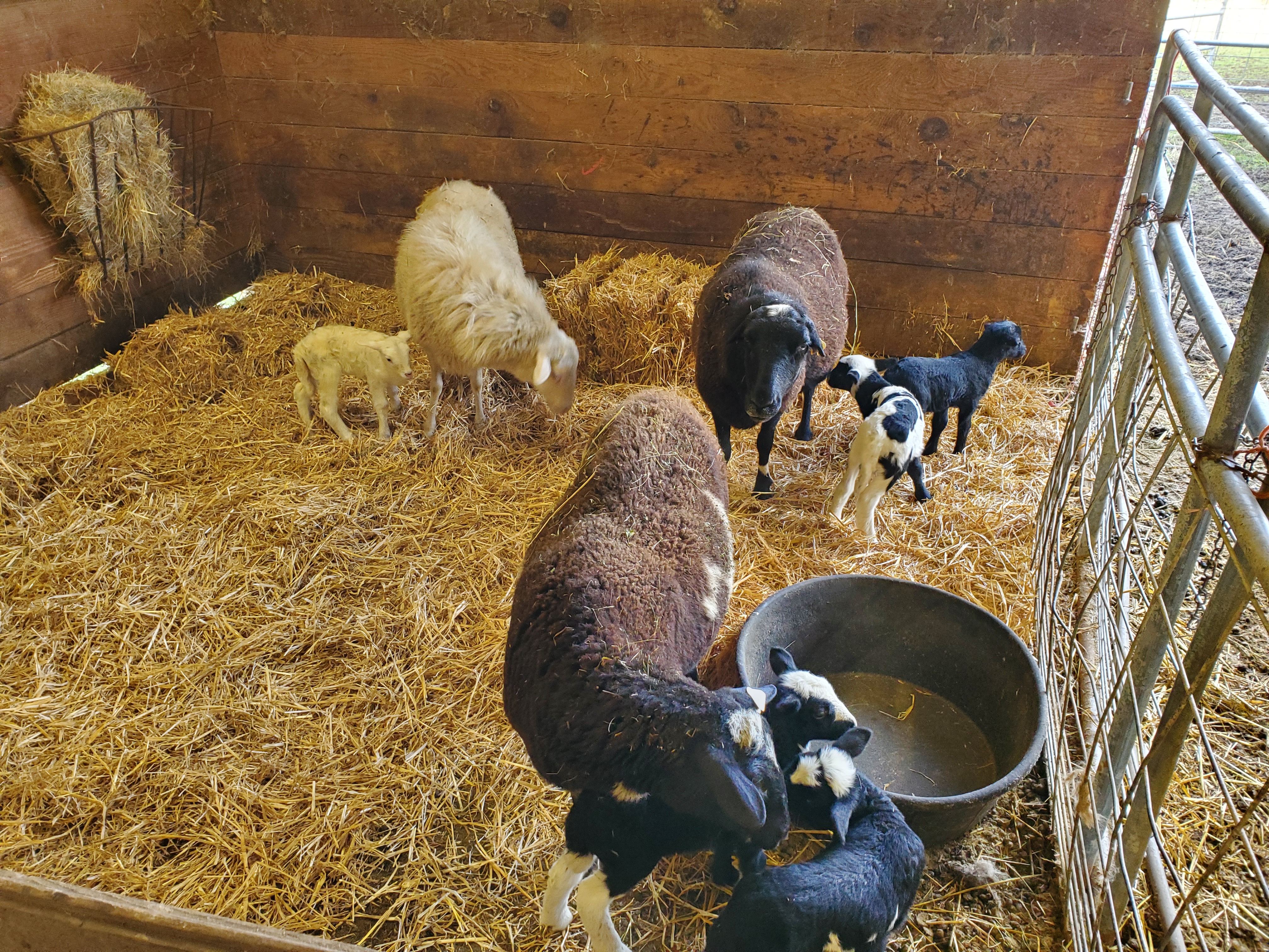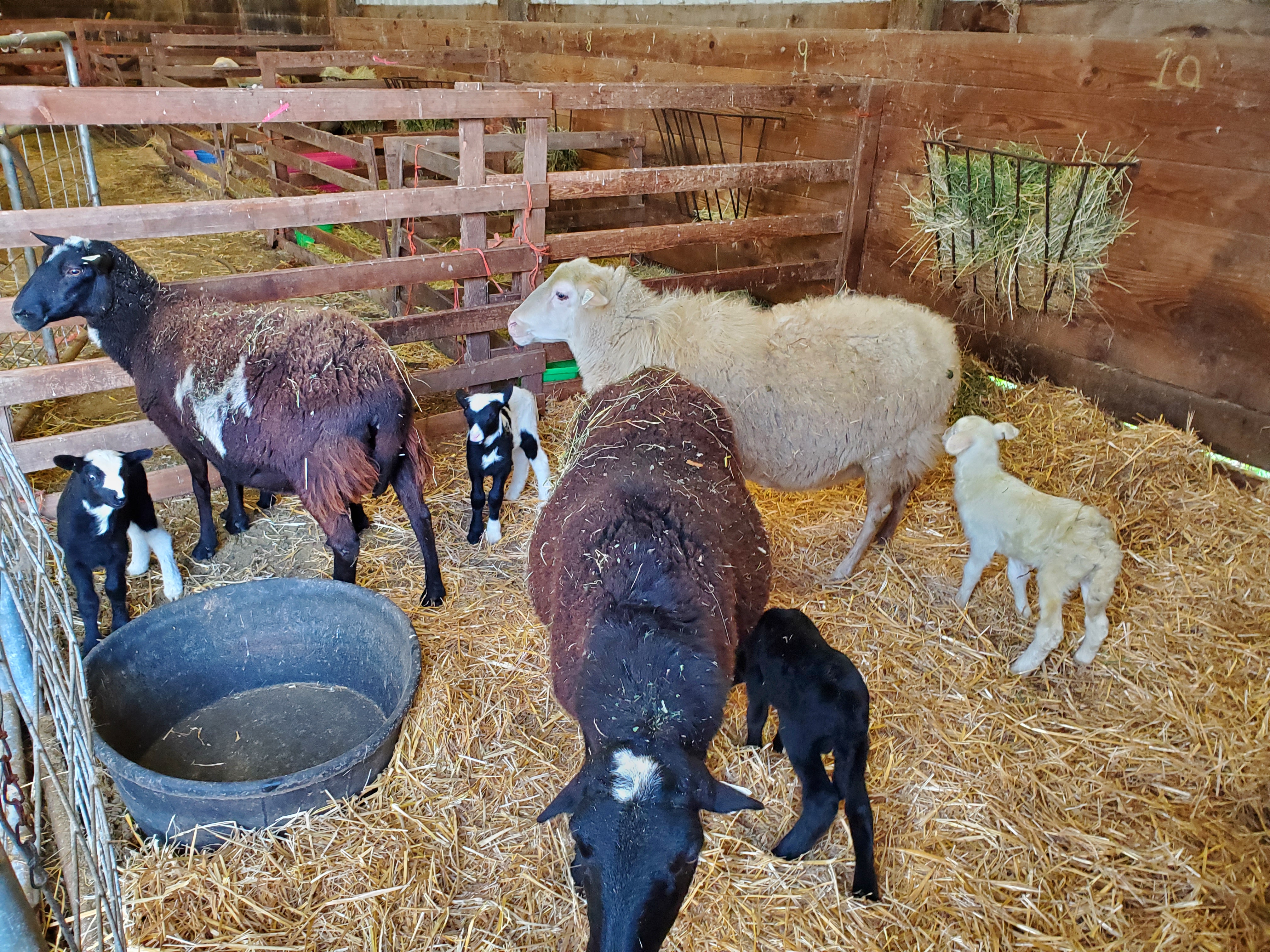 As you can see, a bunch of cute babies! We still have 11 ewes to go but they’ve taken a few days off. Last weekend was spent giving shots, doing ear tags, trimming mama hooves and cleaning pens. We utilized the social pen for some of the moms and babies because I was out of wormer. Here are some pictures of them in the pen and outside the next day. It was a gorgeous, sunny day too!