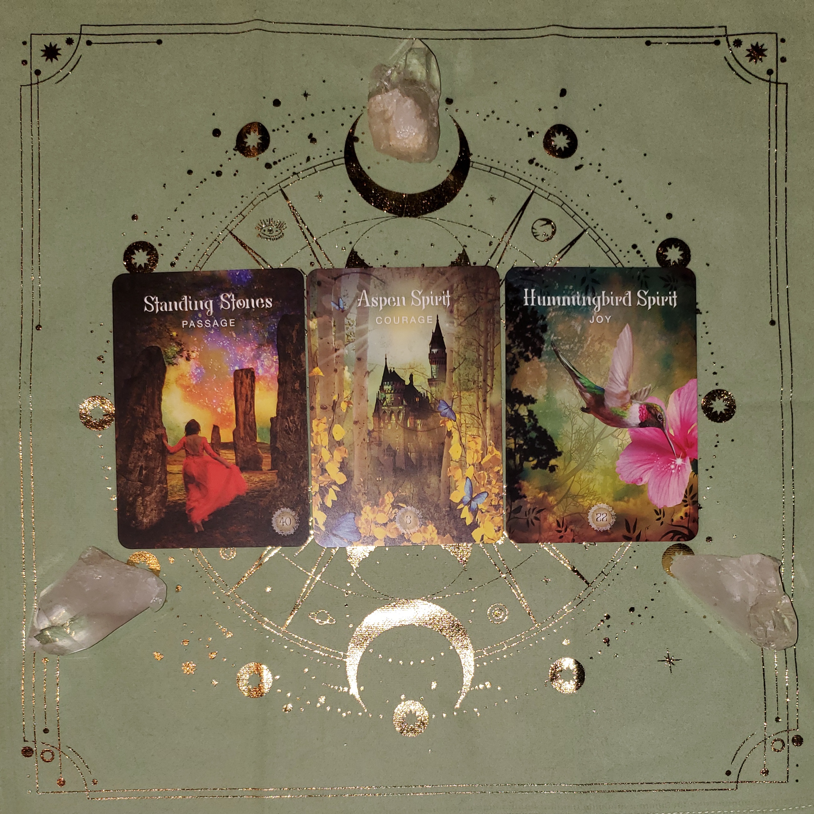 I have to say the Hummingbird/Joy imagery has made itself apparent in a big way today and last night. I had a reading done by someone using her Hummingbird Oracle and I received the Joy card from her. Then while shuffling today the Hummingbird/Joy card fell out of this deck before the reading you see here. Must mean Joy is not only important for myself, but also for all who are reading this!