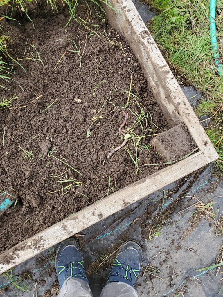 Morganna and I cleaned out the raised bed where we are going to plant peas. We covered it with cardboard though until we can get a few bags of dirt to put in there AND it keeps the kitties from using it as a cat litter haha. The size of the worms in that bed were AMAZING too!