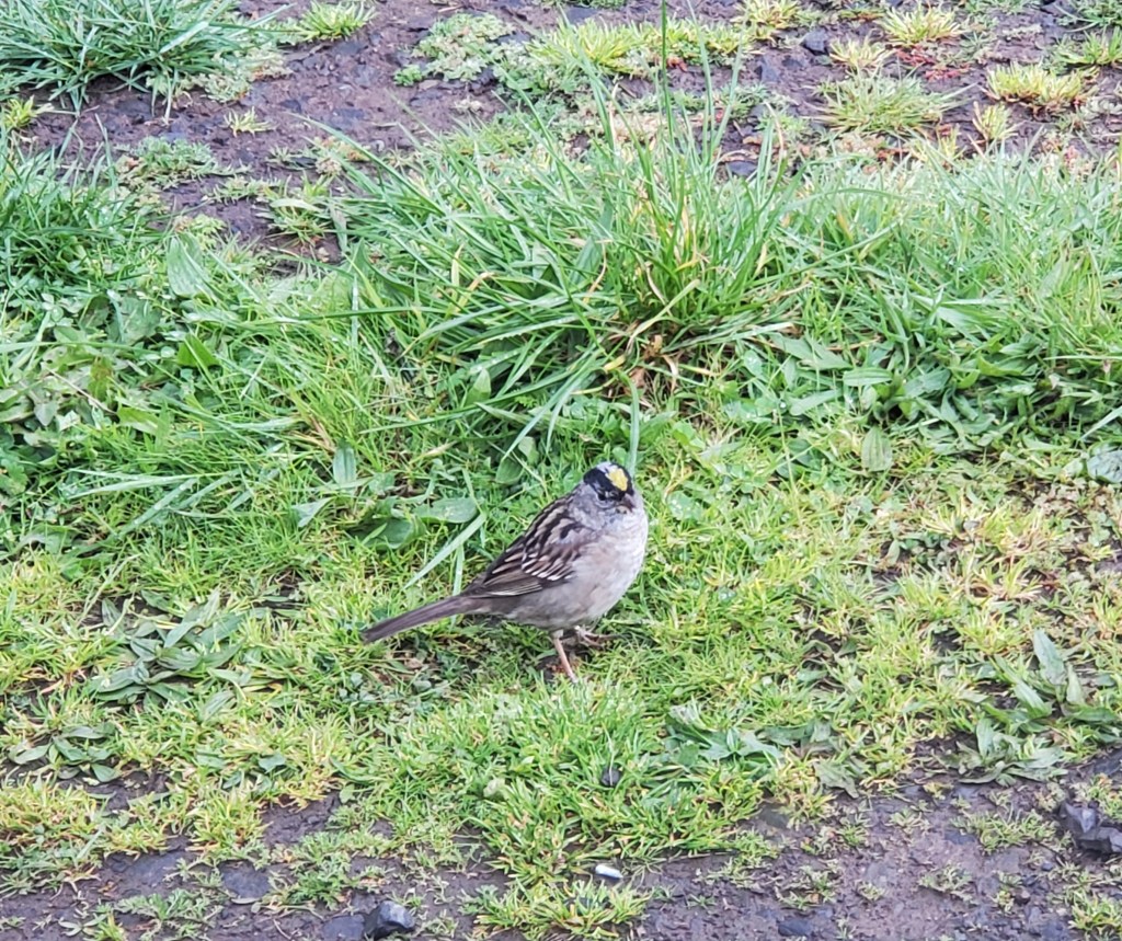 I had just gotten home from taking Morganna to school and was sitting in the van in our driveway when I spotted a bird I had never seen or noticed before. Turns out they are Golden Crowned Sparrows. They only winter in our area and actually breed and summer up in the tundra! Cute little birds! Here is a link to the Audubon Society about them.