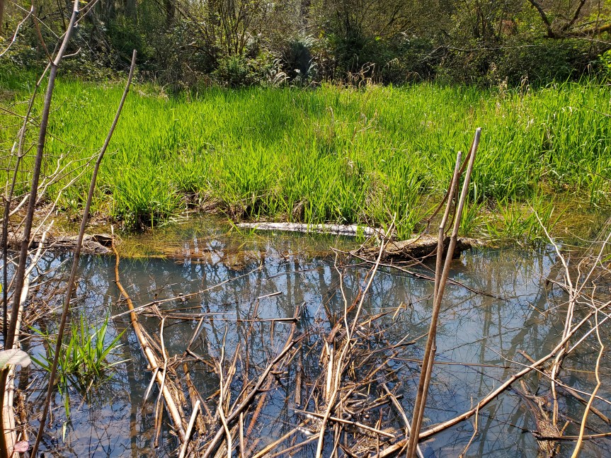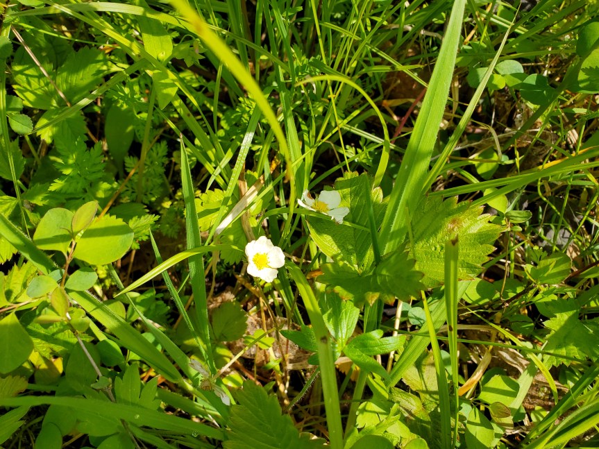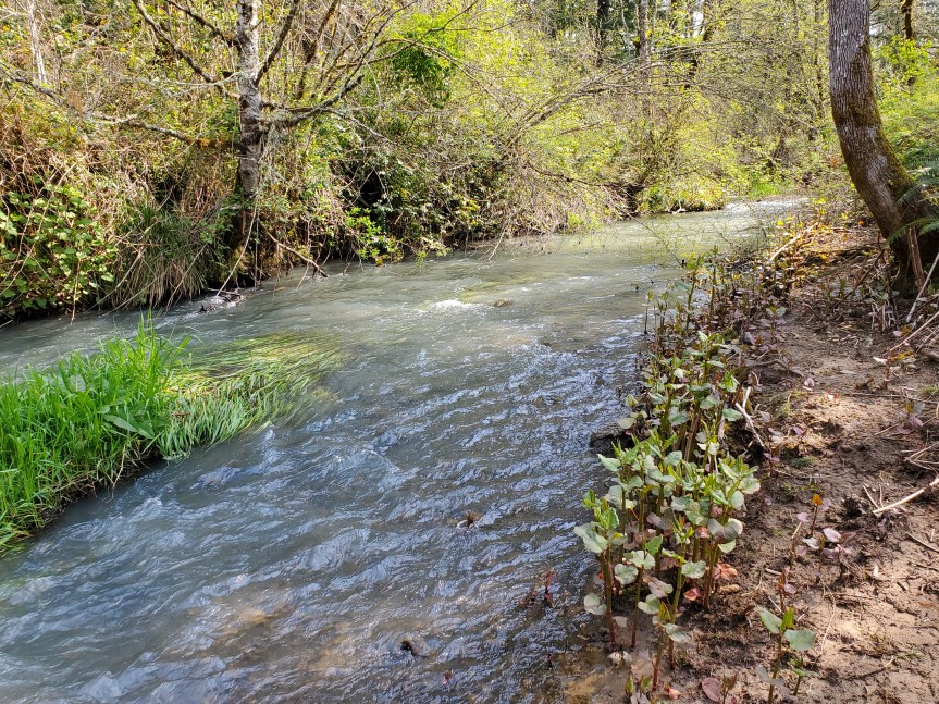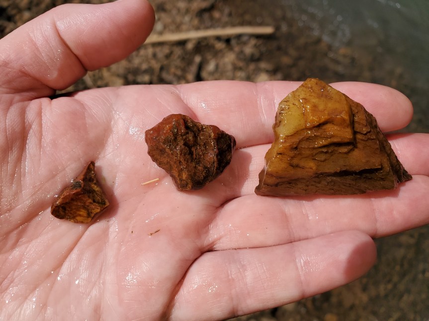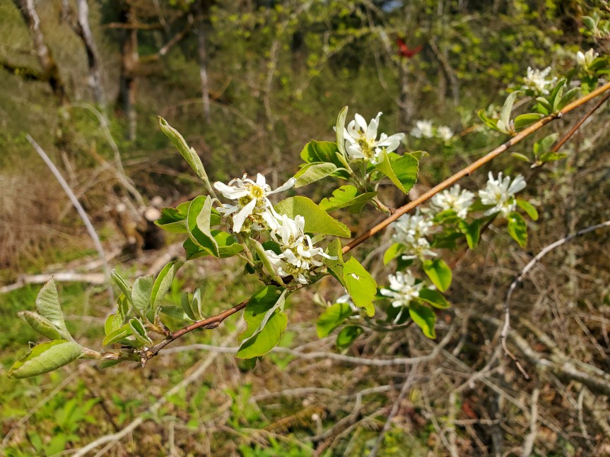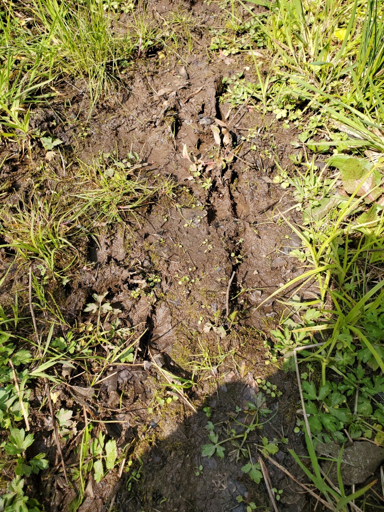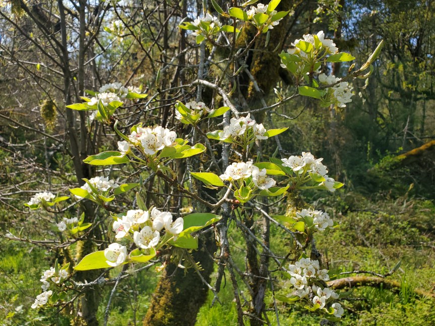 Pictured in the slideshow: Tadpoles in the pond are getting bigger (and the rains made it more full too!), Deer tracks were the only thing I saw in the mud (no bears or cougars nearby maybe), several flowering fruit trees gone wild and wild strawberries among other flowering shrubs and plants, the old hawthorn looked happy, a little log in a wetland spot next to the creek that I always expect to see a turtle sitting on (but never do), the creek was fairly full too, found some petrified wood and carnelian agate too.