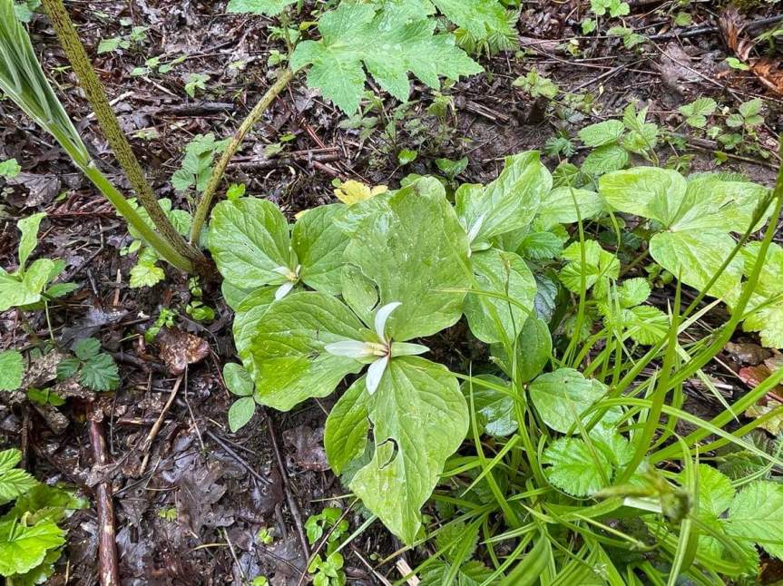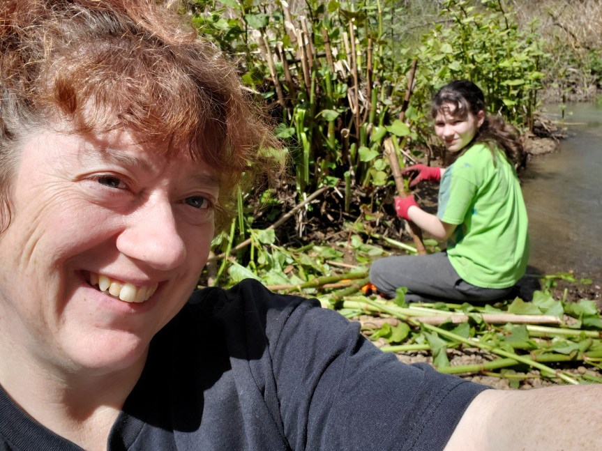 Morganna and I went for a woods walk together on Sunday. Was such a nice day! We even sat on the bank of the creek for a bit. I looked for rocks and she made rafts out of the Japanese Knotweed and kept pealing and slicing them with her knife. I told her we should find some recipes for it since it’s everywhere.