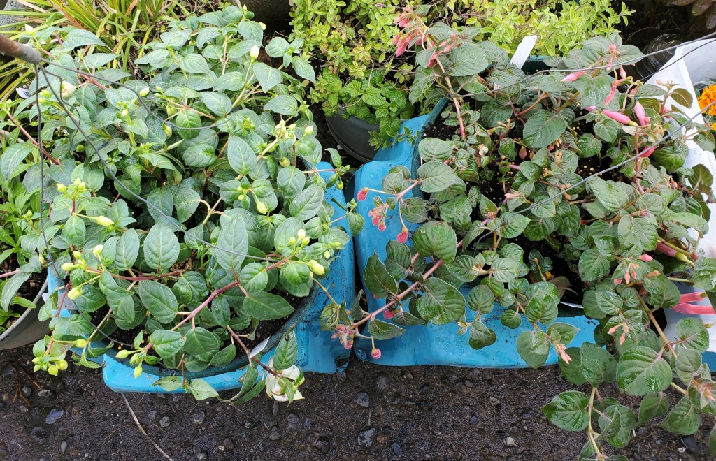 In cleaning out hanging baskets from last year, I noticed we had 4 Petunia plants and a 2 year old Verbena that made it through. Saturday the 7th, I repotted them all into one hanging basket and trimmed them up a bit. See how they do! I also planted a total of 9 hanging baskets from what we bought Thursday: 2 Petunia, 2 Calibrachea, 3 Ivy Geranium, and 2 Fuschias!