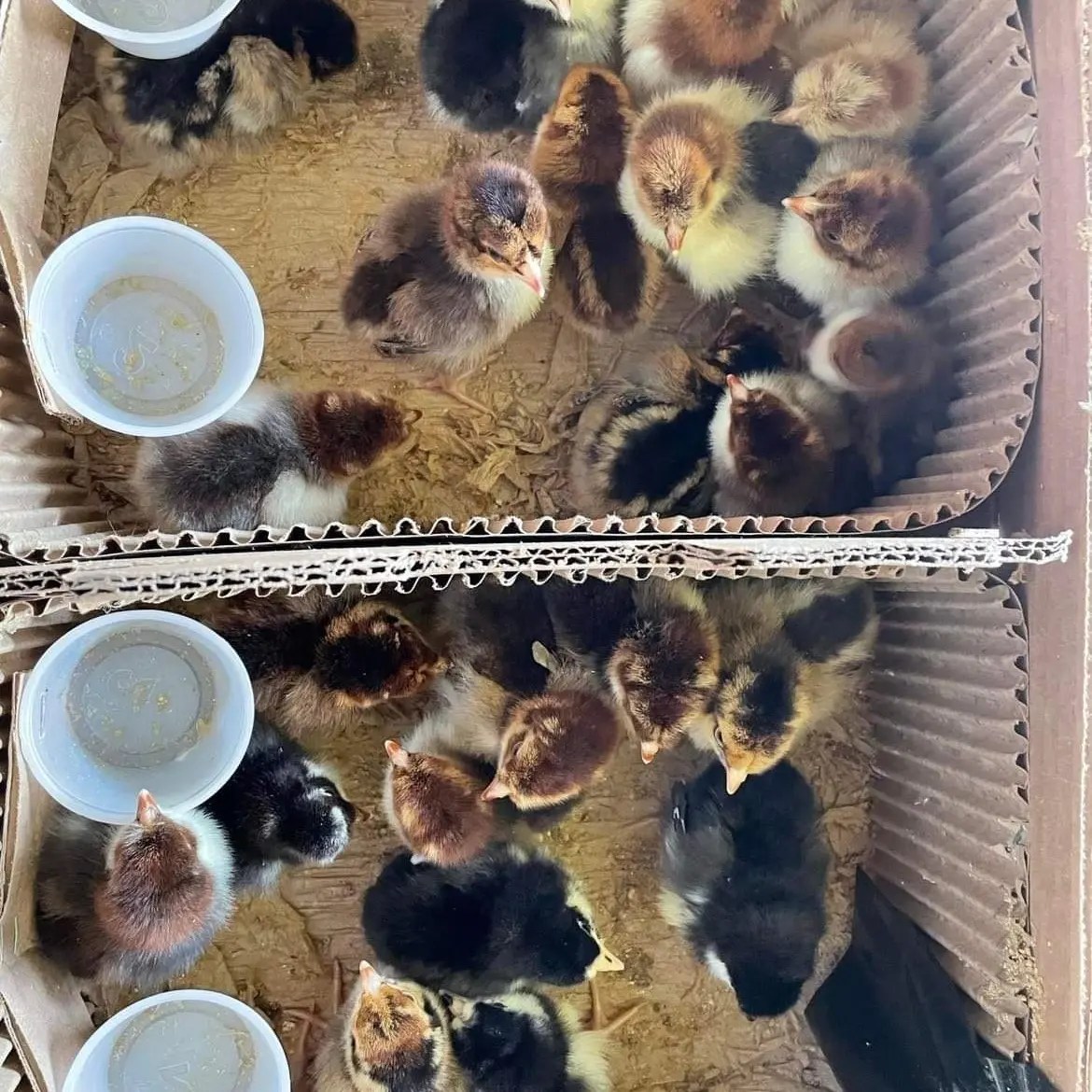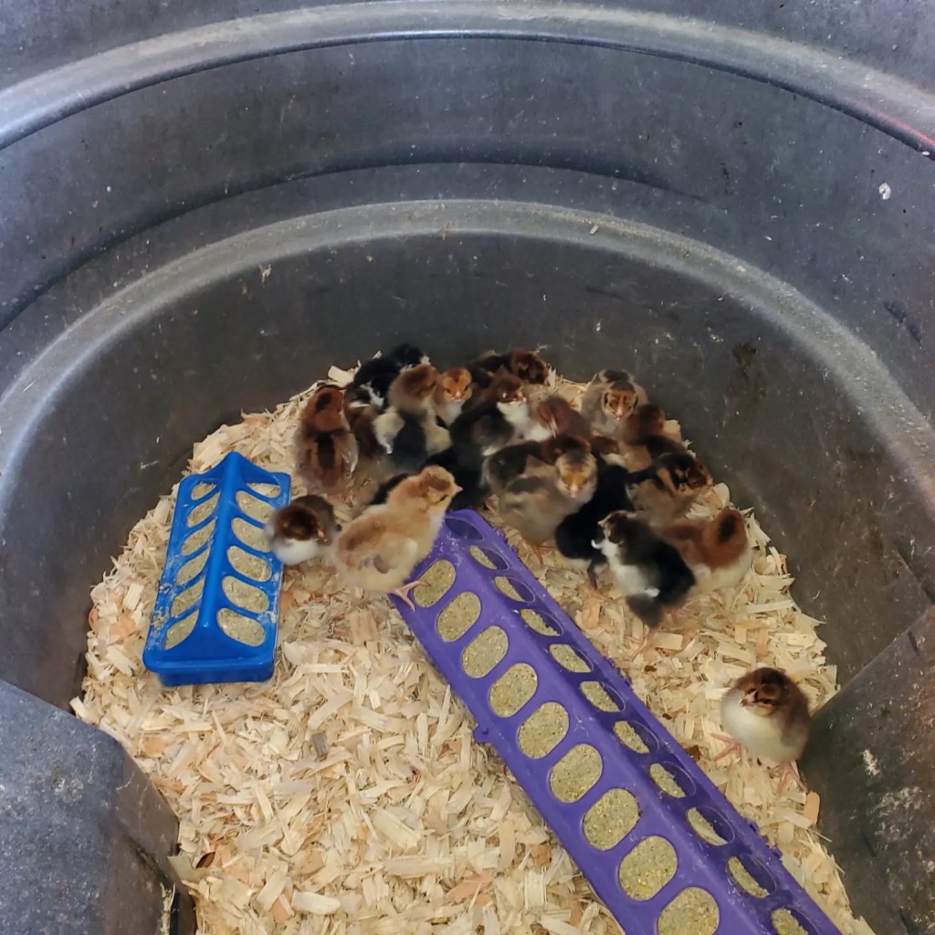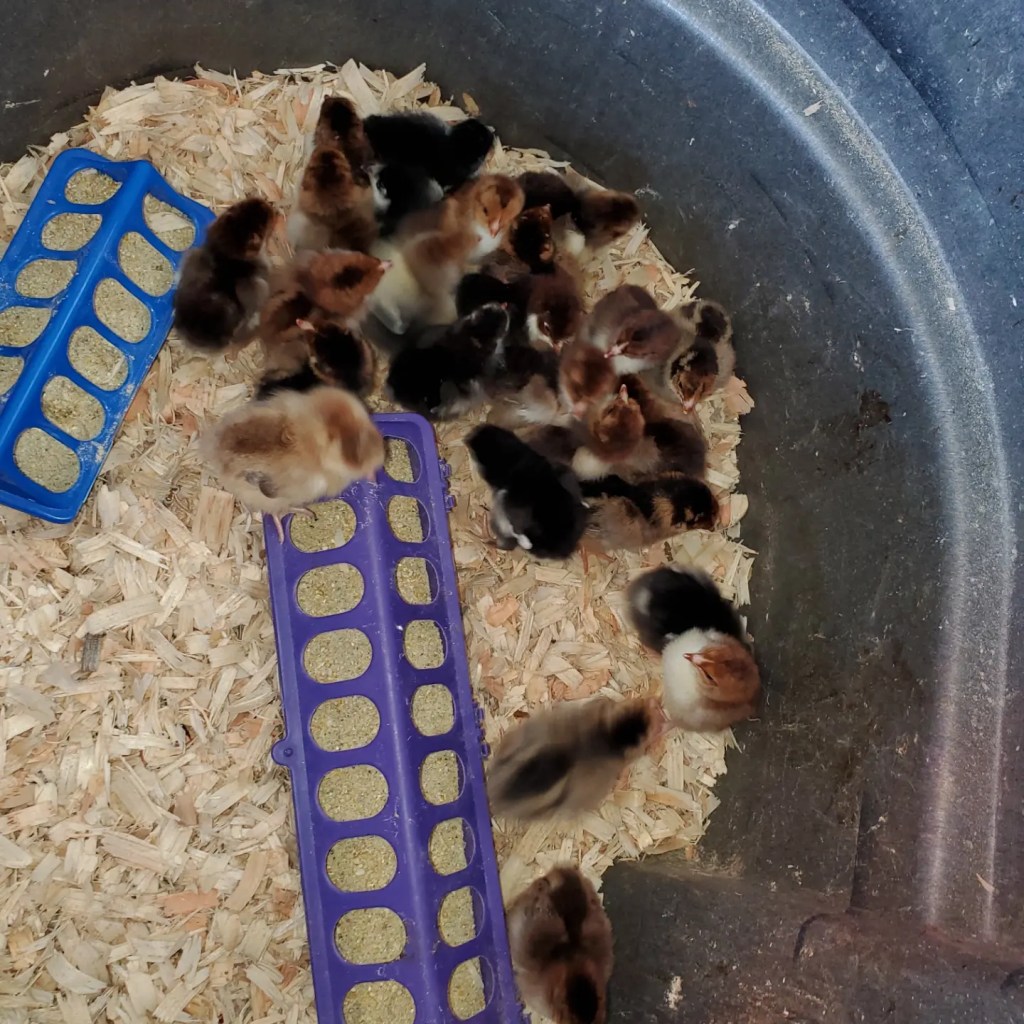 They’ve arrived! We now have 25 straight run (not sexed) Swedish Flower Chicks to add to our flock. Since they’re not sexed, many will probably be roos for eating or selling. You forget just how tiny chicks are until you get new ones again!