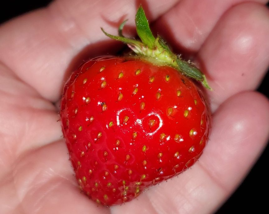 Here’s a cute video of Mazey kitty hanging out in the Charlotte Peach tree in the orchard and our first strawberry of the season!
