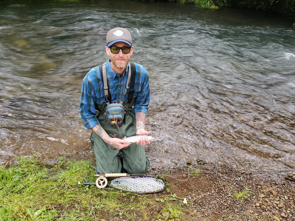 Shane and I went down to visit his family for his daughter’s graduation party on Saturday. We left a little early so he could try out his new fly fishing rod and reel at a cute park down that way. First fish was a dink but the second one was actually pretty darn nice!