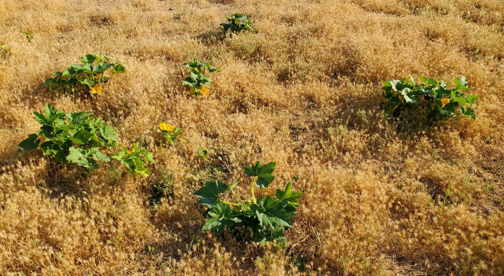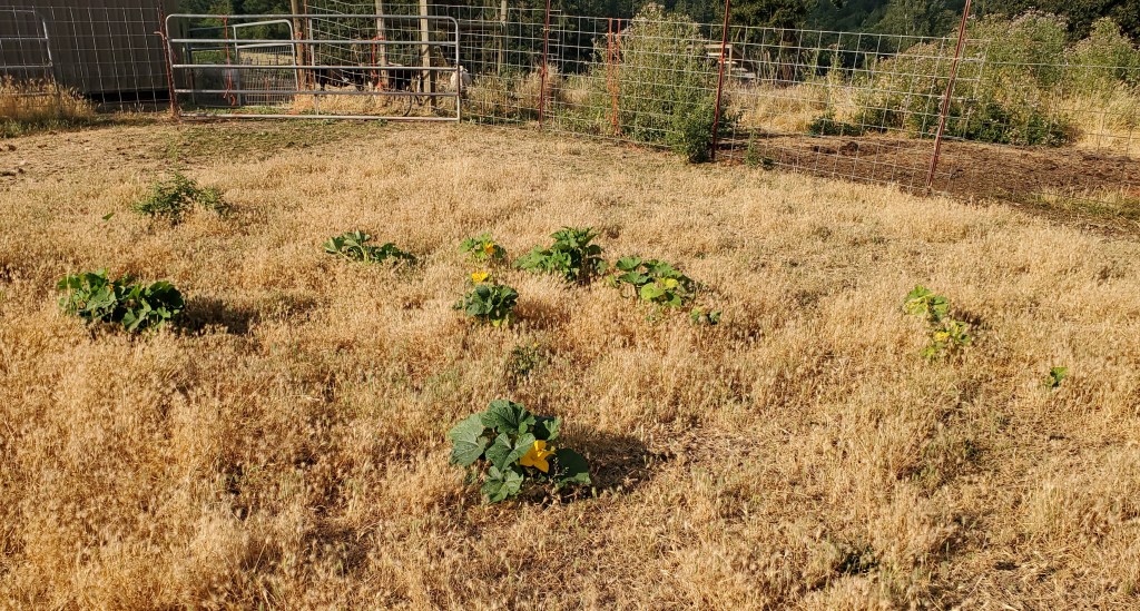 Last winter we put the old Halloween pumpkins out for the sheep to eat when we were finished with them. These weren’t carved pumpkins, but whole ones. We had white, warty, blue, and regular ones out there. Well the seeds sprouted and the animals won’t eat them so we may get more pumpkins out there! Thinking about putting some T-Posts in the ground and surrounding them with cattle panels to see how they do.
