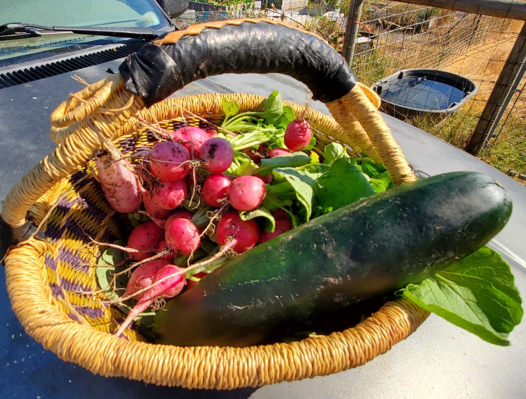 Morganna and I went out to check the garden this morning and harvested a ton of Pink Beauty Radishes and a Spineless Perfection Zucchini! Those radishes are SPICY too! Not growing this variety again hahaha.