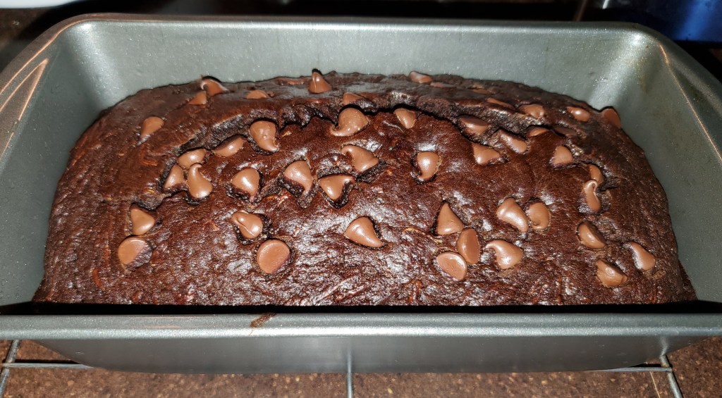 I harvested 2 huge Zucchini from the garden , gave one to Shane’s daughter Avery, and grated the other. Of course I neglected to get pictures of them! I got 4 3/4 cups of grated Zucchini from it. Decided to make a Zucchini bread out of some of it while Avery and her family visited on Sunday the 28th. Double chocolate! So good too! I ran out of flour so had to only make one that day. Made a special trip to the store Monday just to make sure I had enough flour to make more!