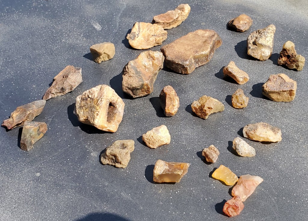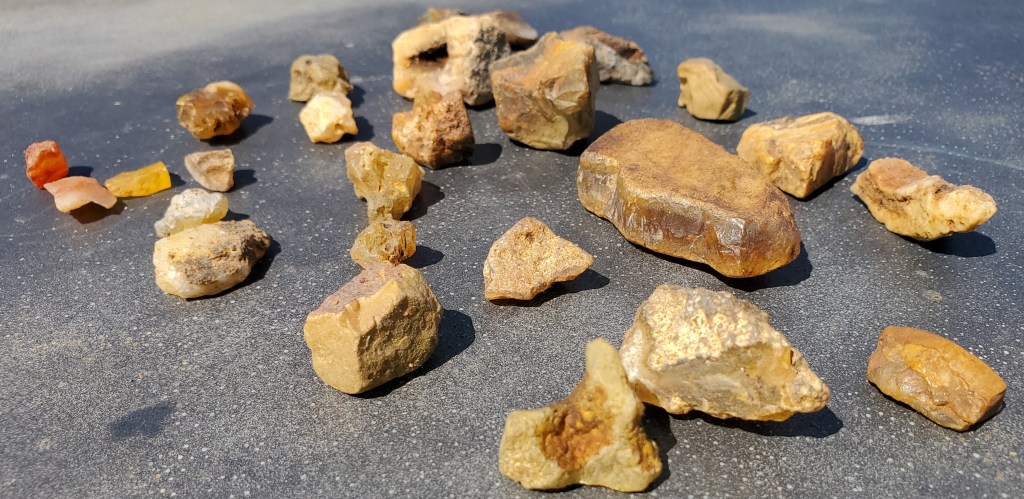 On Friday the 16th, Shane and I went for a quick walk to get the trail cam footage and look for a few rocks in the somewhat dried up creek. These are mostly Agates but there are a couple Jaspers and Petrified Wood in there.