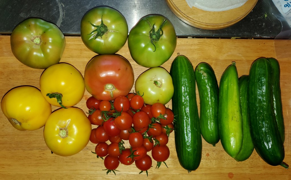 On Friday the 16th I harvested all these tomatoes and cucumbers!