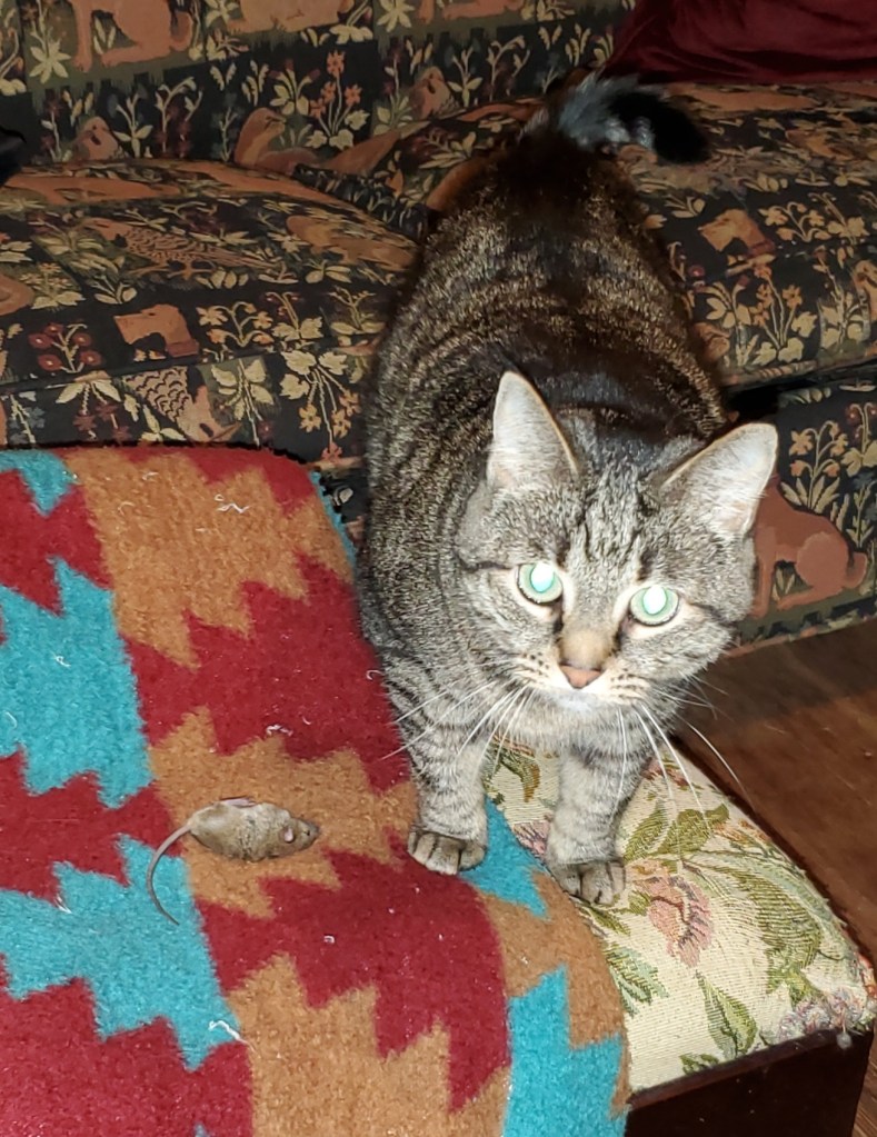First, I’m upstairs, saying goodnight to my daughter when I hear my mom say to hurry back because Freya caught a mouse and brought it to her lap. This seemed like a joke at first because our fat house cats are terrible mousers. Sure enough, I go downstairs and find Freya with a LIVE mouse on mom’s lap!! I took it outside and gave it to Mazey kitty who made short work of it. I almost felt bad.