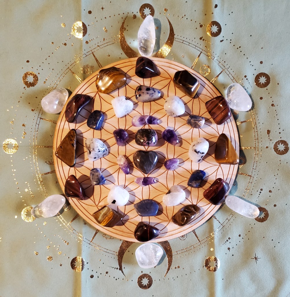 Center is Rhodonite creating a positive feeling for yourself and Black Moonstone for helping to create a quiet mental space for you to turn your attention inward and determine what is most needed in your life. Surrounding these is Amethyst for help with change and transformation. The next circle has Sodalite for stability during divine transformation and Rainbow Moonstone to overcome negative thought patterns or self-limiting beliefs that may creep into your head. Next is Golden Tiger’s Eye for providing clarity during your intention setting ritual and Red Tiger’s Eye for stability much like Sodalite’s purpose. Finally the outermost Circle is Clear Quartz for mental clarity.