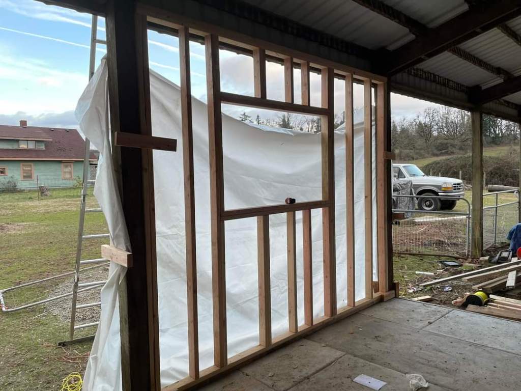 Shane’s been hard at work building his woodshop in our barn overhang. He had just enough money to do a 12×12 section of it. Concrete was put in over last month and this past weekend he’s started building walls.