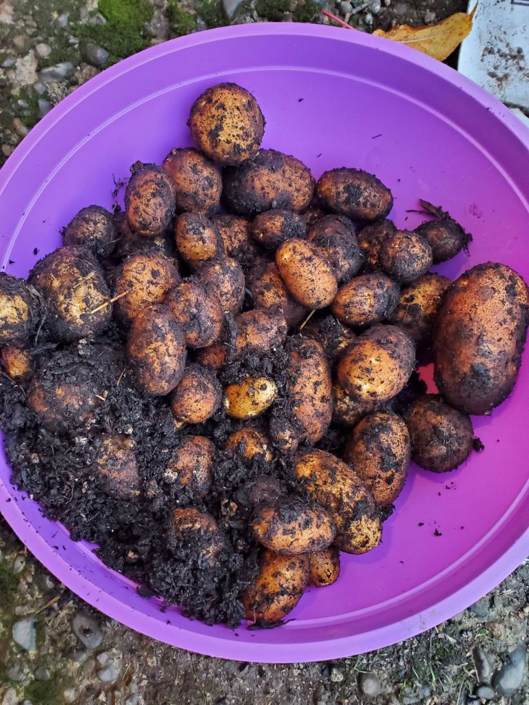 We needed to get to planting the garlic, though much later than I would have liked. The raised beds were still producing into late October! Everything was pulled out (except the beets) and tossed into either compost piles or to the chickens. Dumped out the potato bags and look what we found! We roasted them and ate them for several dinners!