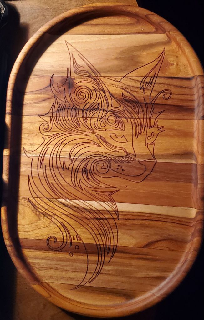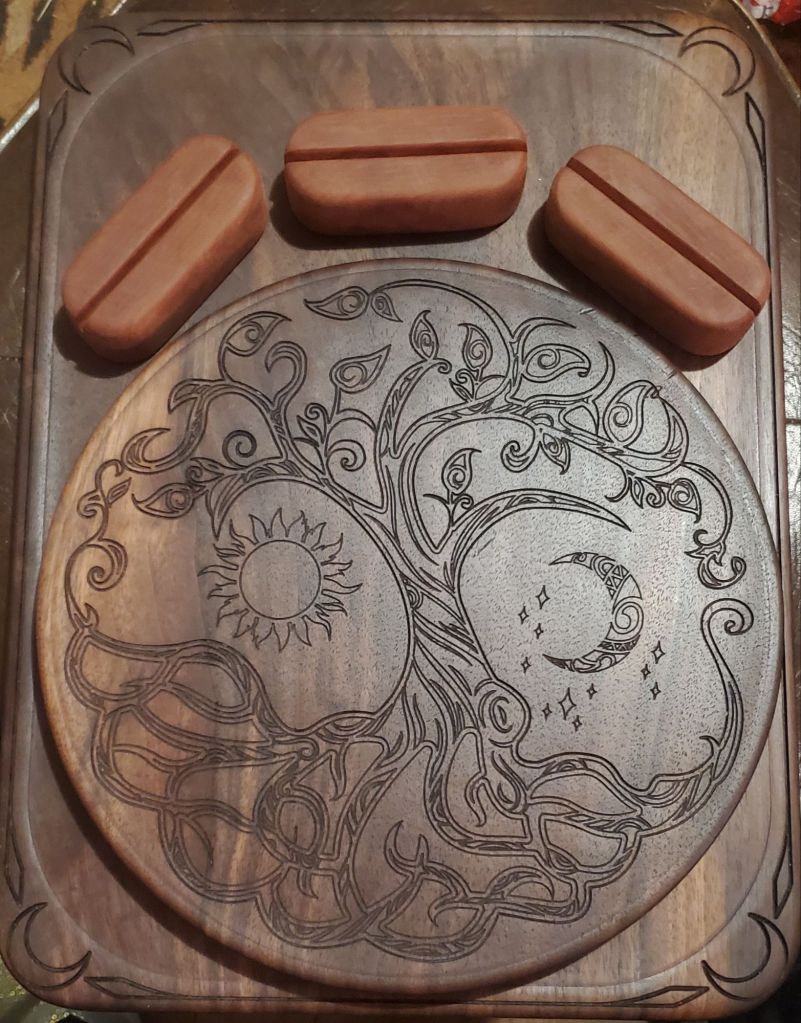 Now that Christmas is over, I can share with you what Shane made in his woodshop for family/friends! Pictured below are the items Shane made for my daughter and myself. He made her a teak tray with a cat carved in (which she immediately used for her beading projects). He made me a shallow walnut tray with moons at the corner, a round walnut tree of life, and three maple “twinkies” that can hold cards. He’s making me a few more little things to hold tea lights and crystals too. I can’t wait to start using my tray for videos on my Crystal Caves Mystic YouTube channel! He made several smaller walnut (and a few purple heart wood) dish sized trays for his family members with their names carved in and for the kids some bigger trays like the one he made for my daughter.