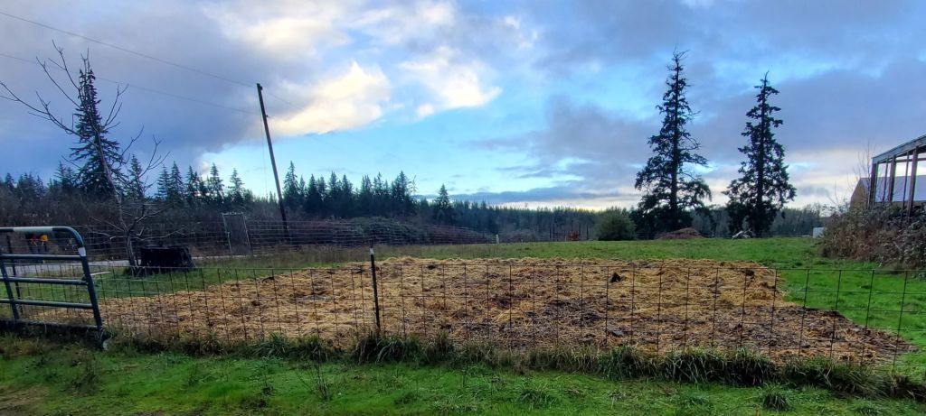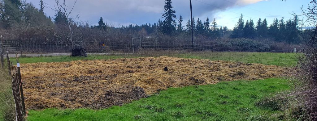 This time of year we don’t really have gardening to work on (other than prepping for spring if needed). It’s a good time for maintenance, however. Pruning fruit trees that have gone dormant, making sure tools are sharpened and put away where they won’t rust, maybe laying out new garden areas, etc. We did start prepping the front yard for the new garden area. All that barn cleaning had to go somewhere!