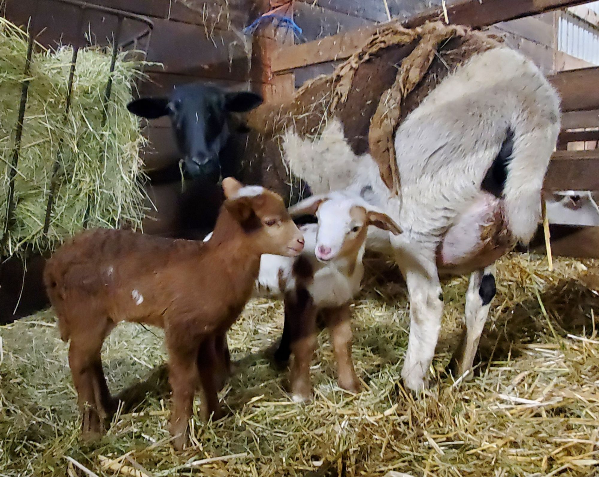 3 year old, 25% Recorded Katahdin (50% Dorper/25% St Croix also) ewe, Pixie had her first twins (single last year). 9lb ram (white/red), 9lb ewe (more red) sired by Registered Katahdin ram, Archie. She’s doing great with them! Huge udder, great mom.
