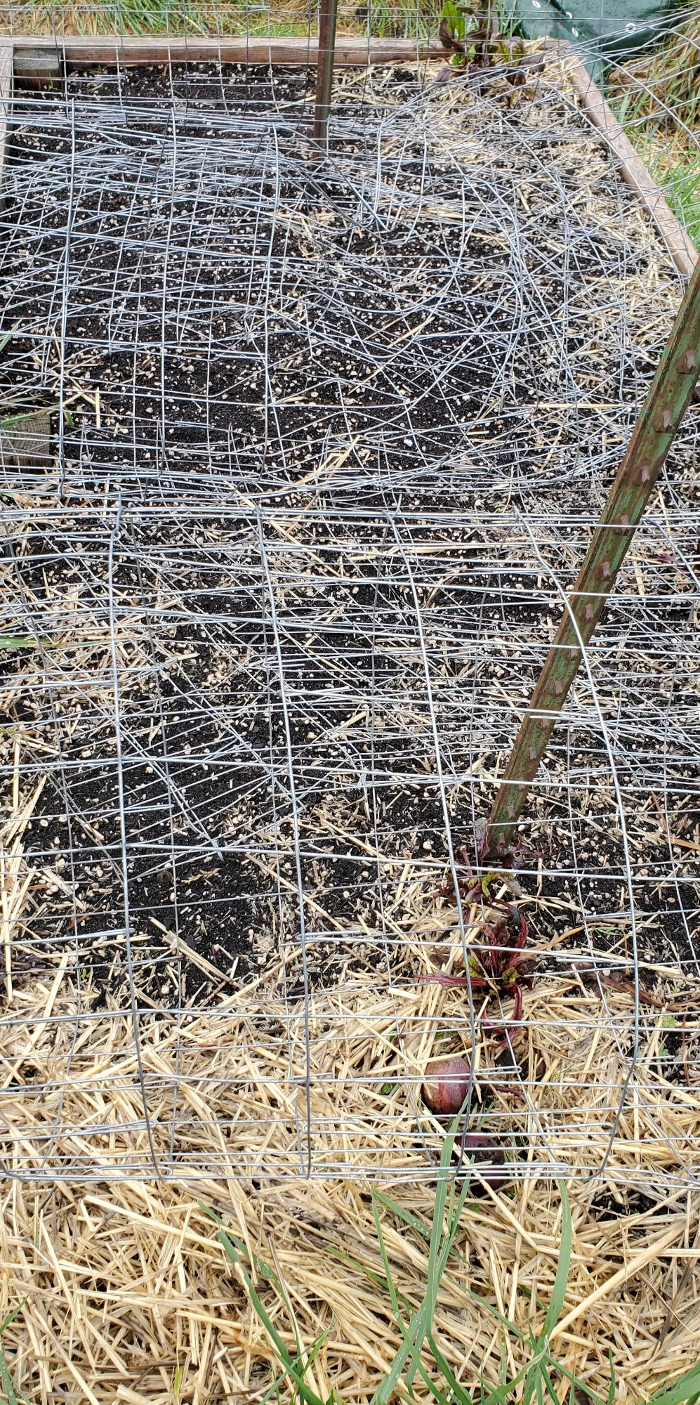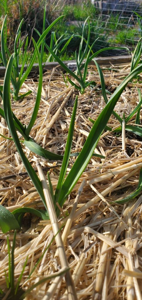 I’m seeing some yellowing in the greenery of the hardneck bed (last month I thought it might have been frost damage from weather in the teens) so fertilized with higher Nitrogen after the Last Quarter Moon. The softneck and Elephant Garlic seem to be okay. Removed some of the straw before I fertilized too. Photos taken March 16th, 2025 and March 21st, 2025.