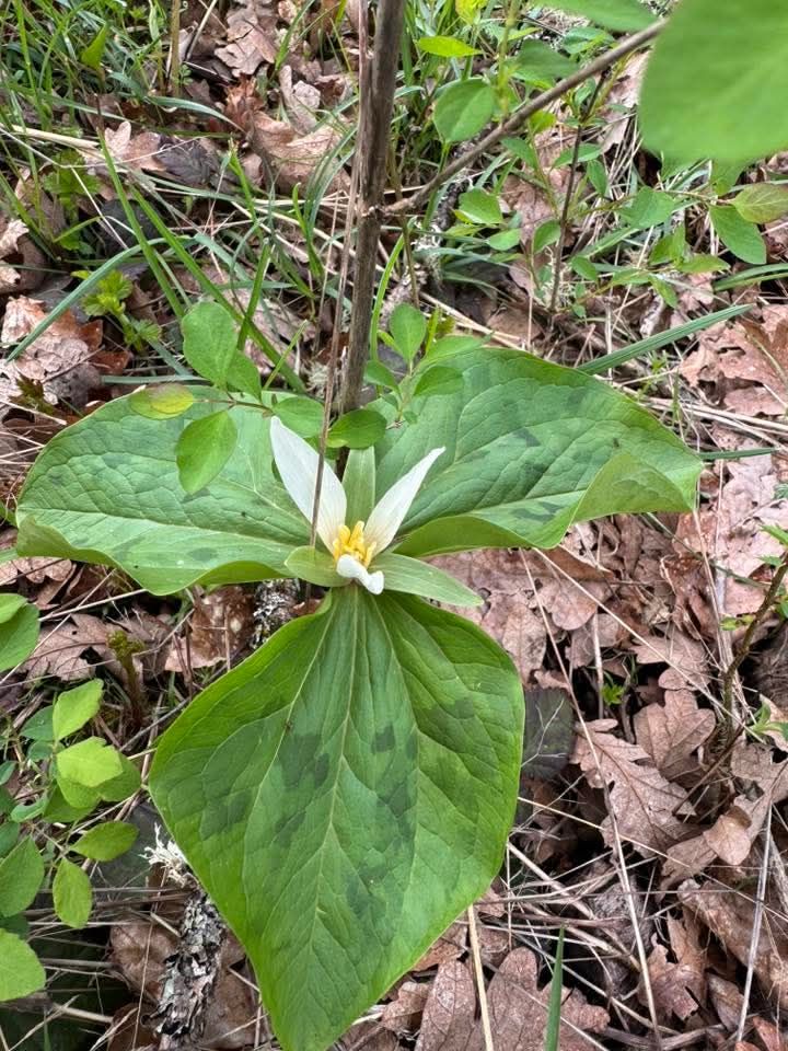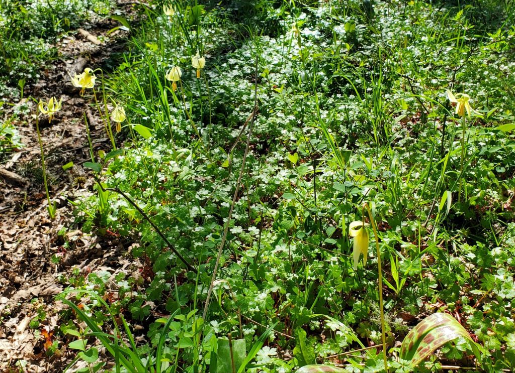 Shane and I went for a late afternoon walk in the woods on April 5th. The Fawn Lilies are out more than I’ve ever seen before! They really like to come up RIGHT IN THE PATH we walk to the woods. We know to tread carefully through there though. The trilliums are blooming like crazy and noticed the Oregon Grape starting to bloom (though no pictures this trip).