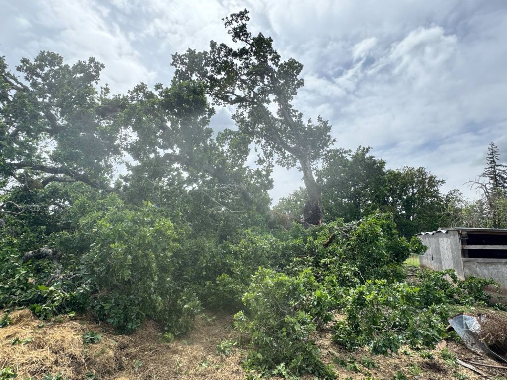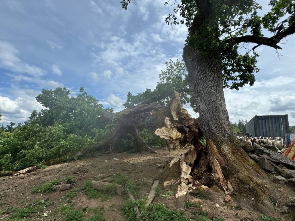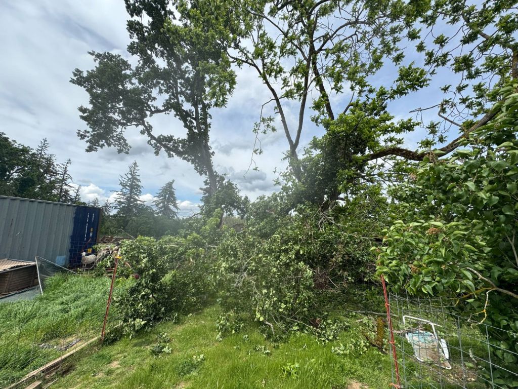 Our HUGE old Oak tree split in half and came crashing down shortly after Mother’s Day. It was super rotten at the base. Now the part that’s left is leaning hard toward the barnyard and needs to get cut down before we have some strong NE winds. Fortunately, only one cattle panel took a hit and nothing else was damaged. The animals in that area also got out of the way in time so no injuries/fatalities. That poor tree took a big hit during the February 2021 Ice Storm and this just finished it off. So sad!