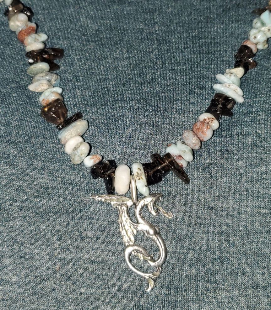 Larimar and Smokey Quartz beaded necklace with a flying serpent pendant. The Larimar isn’t super high quality so only a few chips show the characteristic blue/green coloration. I picked a darker Smokey Quartz to offset the light color.