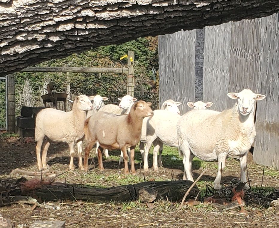 Old retired Katahdin ewe, Sugar, out with her flock of keeper ewe lambs for the winter. They get to hang out with our old 31 year old horse, Tinky.