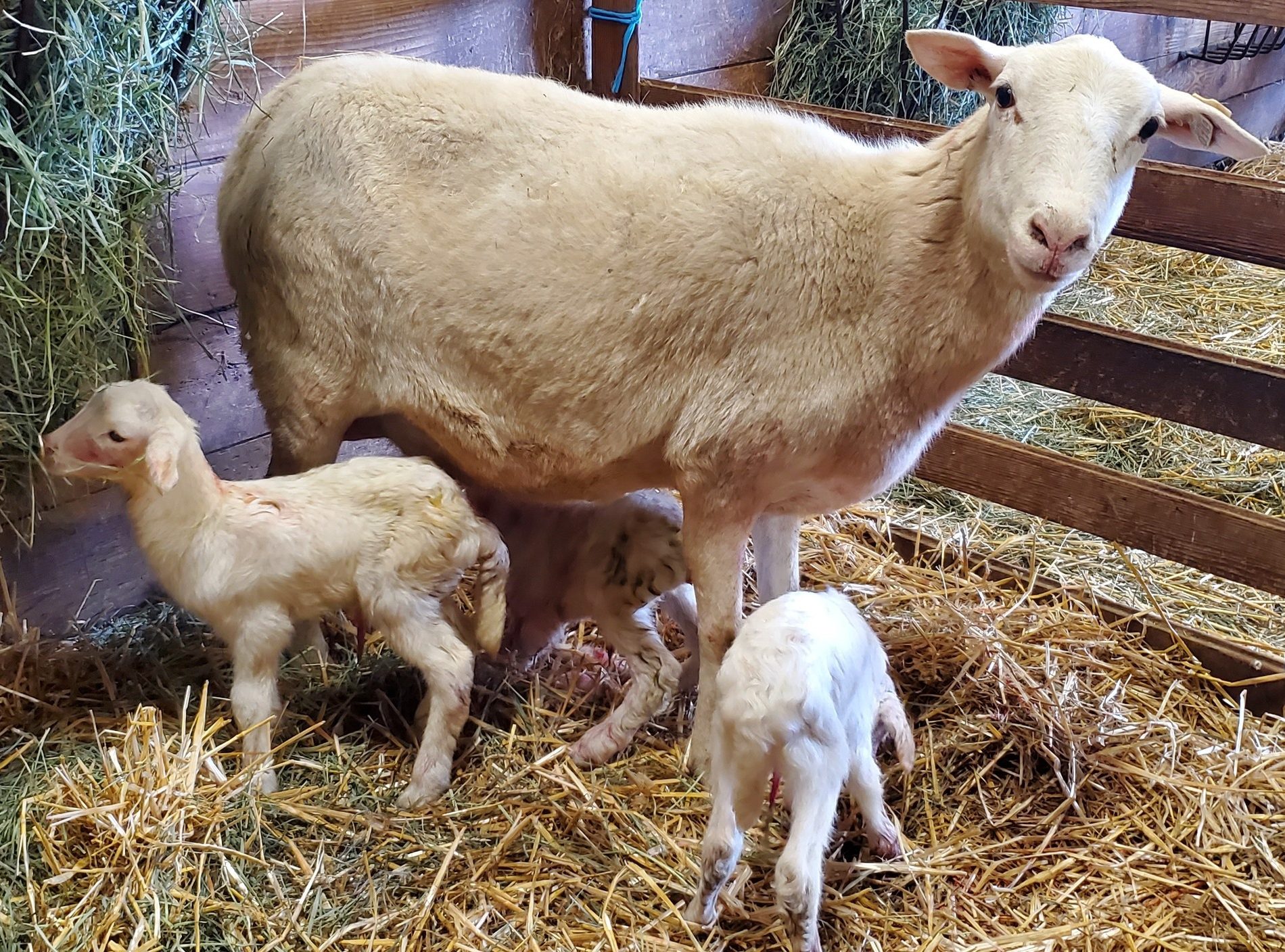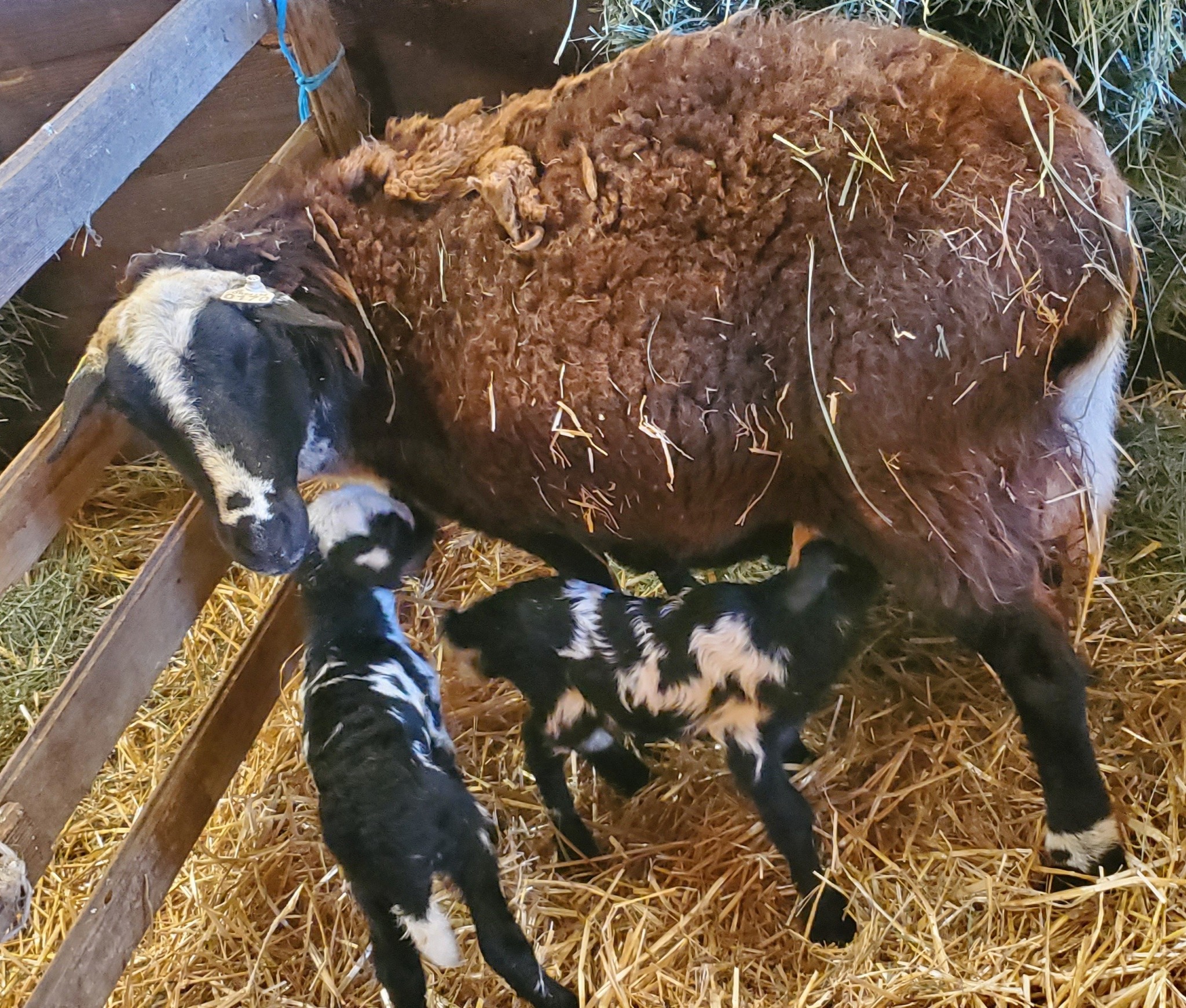 Gave birth to triplet ewe/ewe/ram lambs 2026.
